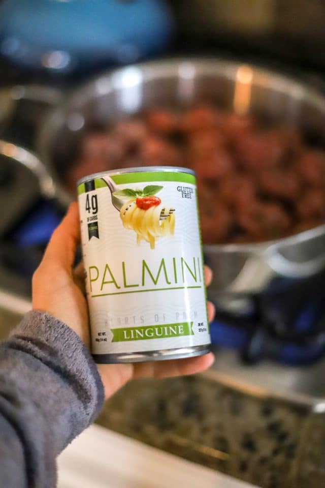 These paleo meatballs also fit my current Pegan lifestyle. I use grass-fed beef and while the kids and David’s get regular rotini pasta (I’ve liked Jovial’s 100% organic einkorn lately), I’ve been using my new faux-noodle obsession- PALMINI! It’s made from hearts of palm and I love the firm texture and the ease of use (open can, rinse, heat, serve).