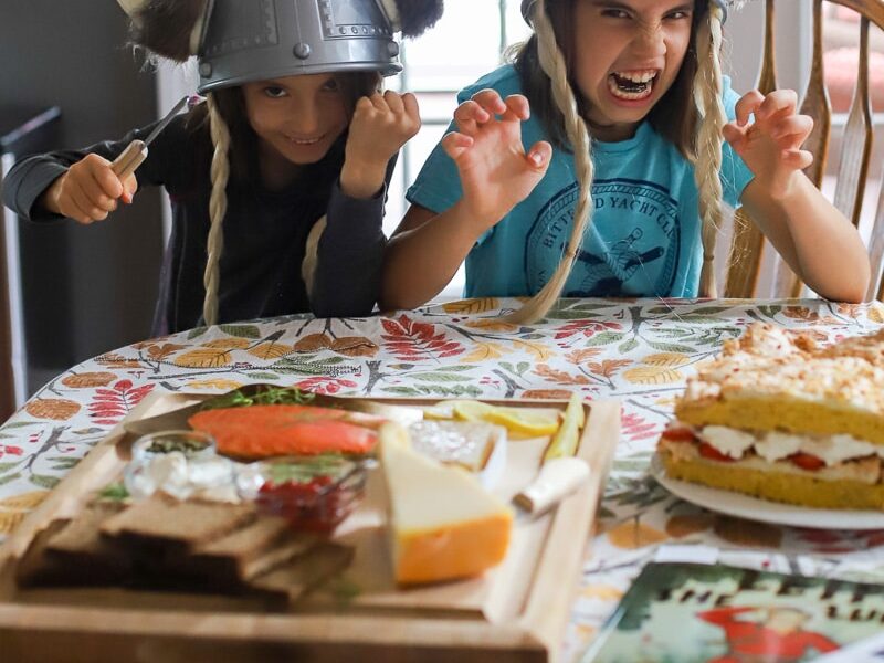 I was so proud of the girls for trying all the foods! None of us were wild about the salmon (we wouldn’t have lasted long as a Viking for that, among other reasons), but the capers were a surprise hit! The Swiss cheese was loved by all, but the girls said they’d stick to sourdough over rye.