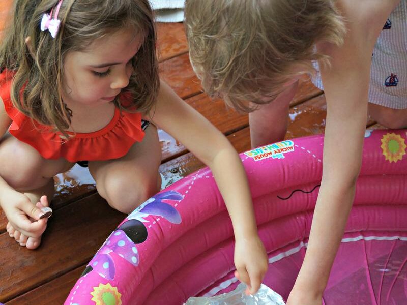 The Fun Factor: Hailey and her friend (ages 3.5 and 4) loved this! Both the adults and kids made boats, then we counted pennies one at a time. Bonus fun points for being able to do this outside in a baby pool to enjoy the summer weather!