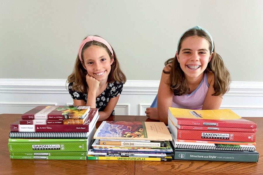 We’ve been in full summer mode around here, currently road-tripping but also splashing around, watching movies during storms, and enjoying a less demanding schedule. If you need proof of summer mode, just check out the pictures I have of the girls below, with wind-dried hair, when I forced them to snap a pic with their new curriculum- lol! Adding haircuts to the to do list…