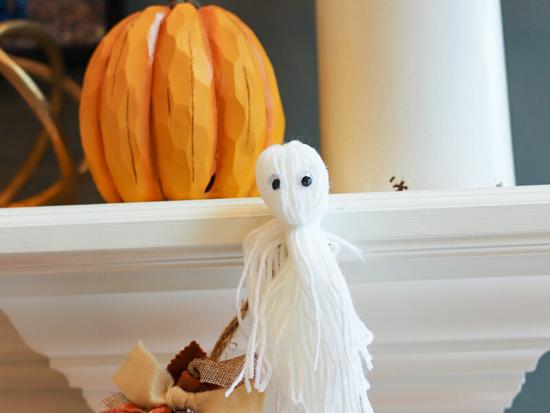 These are so simple. Wrap yarn around a piece of cardboard(at least 5 inches long) about 100 times. Tie a piece of yarn around the top of the looped pieces super tight, then cut the other end of the looped yarn and remove the cardboard. Create the head by sitting it upright and tying another piece of yarn about an inch below the original tie. Glue on eyes. Or google yarn ghosts to get 100 variations.