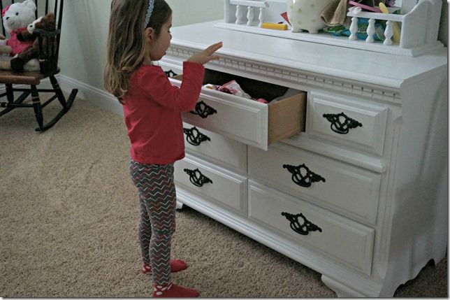 3. Puts up her Clean Laundry. Understandably some things I still have to do, like hang up shirts, but anything that goes is a drawer is her territory. I have fond memories of my mom piling our clean clothes on the stairs and you sure as heck better not step over it on your way up. I hope to instill the same fear, ahem, sense of ownership in my girls. Hailey sometimes helps separate the clean clothes, then I hand her stacks to take up to her room.