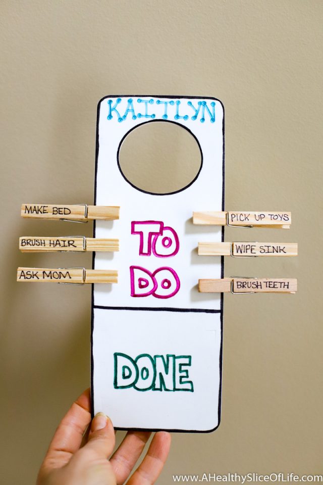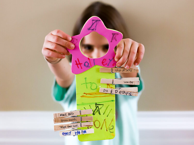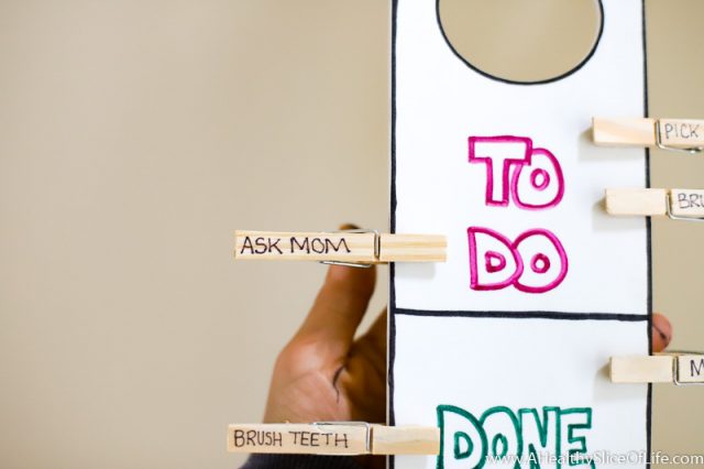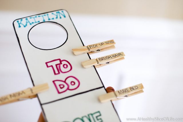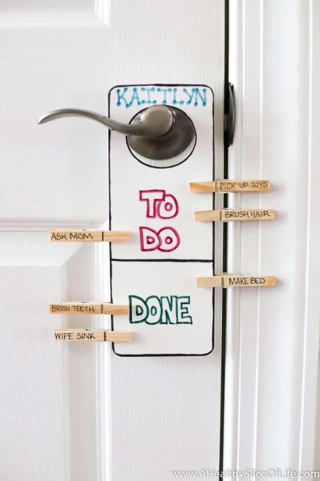 This clothes pin responsibility chart is a quick and easy craft that serves a purpose. By hanging on their door knob, kids are easily able to see what is expected of them each morning and get the sense of satisfaction and pride as they move each clothes pin to the “done” section!