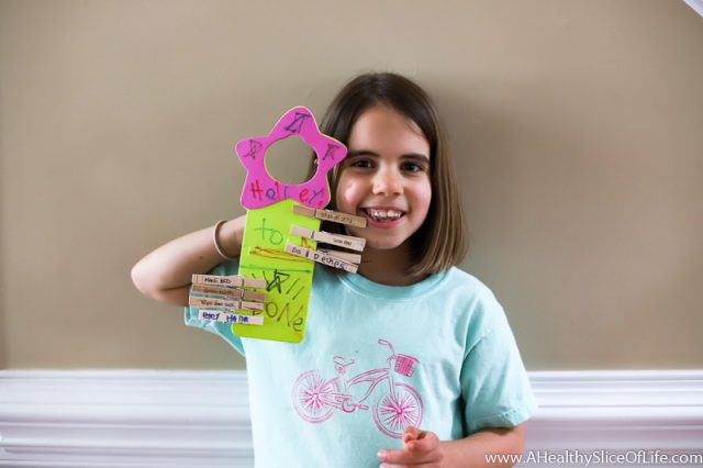 I used a Sharpie to outline the foam hanger and divide the section into to do and done. I wrote her name at the top then wrote her responsibilities on both sides of the clothes pins. Of course there are a million ways to alter this, as you could section it off from left to right instead of top to bottom, so feel free to go wild.
