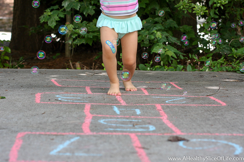 We love being outside, my 2.5 year old is always asking to be outside! We like to blow bubbles, draw with chalk, enjoy snack time, pull out the water table and sprinkler. We also enjoy kicking the soccer ball, playing tball and going on the swing. And this year is our first year with a vegetable garden so we enjoy checking it out, seeing if there is anything we can harvest or eat on the spot 😉