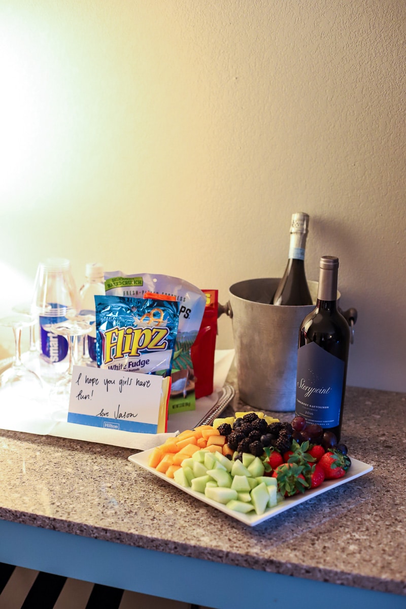 We had just pulled our luggage into the room when a hotel worker knocked on our door, carrying a tray of goodies and wine. Jaime’s husband then earned all kinds of brownie points and our girls weekend was off to a celebratory note!