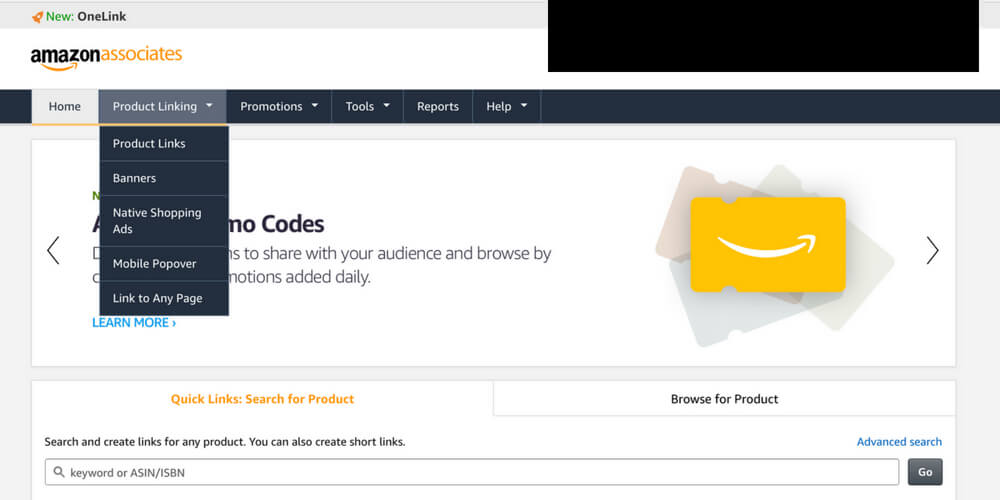 Once you have access, you will see a “Product Linking” tab, from here you can create “Product Links” (trackable URLs that will take readers to the product you choose on Amazon), “Native Shopping Ads” (seamlessly integrate highly relevant recommendations in a responsive ad unit), “Mobile Popover” (enhances links on mobile by showing a small pop up at the bottom of the screen when a user scrolls past the link within the article), “Link to Any Page” (build links to pages on Amazon including popular pages, as well as letting you link to the results of your own Amazon search).