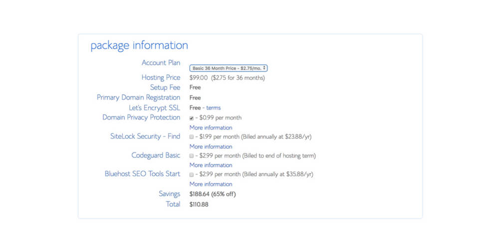 – I suggest selecting the Domain Privacy Protection. This hides your personal information from anyone who might search for it. This is important for your privacy and safety. You do not need the other add-ons that Bluehost sells, so I suggest unchecking any of the extras that are listed.