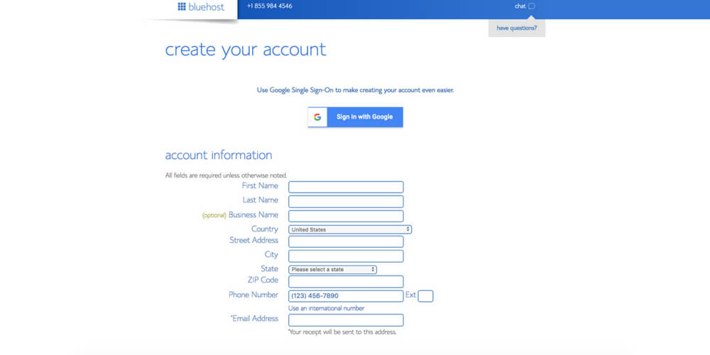 Next, fill in your personal details in order to create your account. Your personal information is absolutely safe and secure. Bluehost won’t spam you or sell any of your information either.