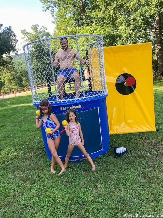They were finishing some repairs of the splash pad on the Friday we arrived, but had provided inflatable water slides and a dunk tank to compensate for the closure down by the lake. We took full advantage of these, and had a lot of laughs at the dunk tank!