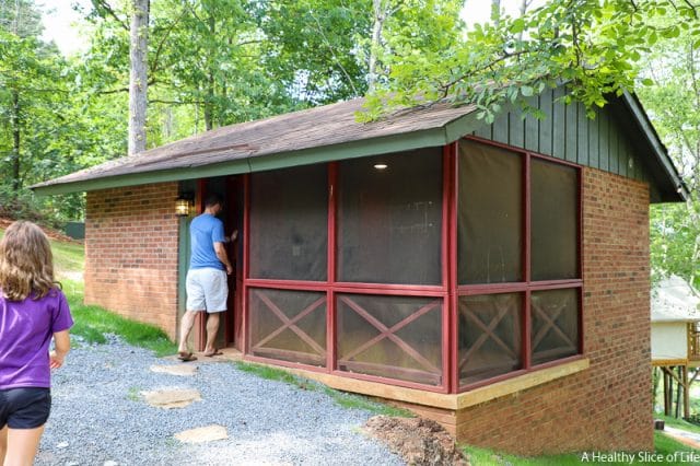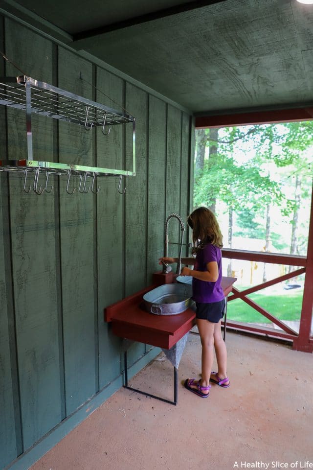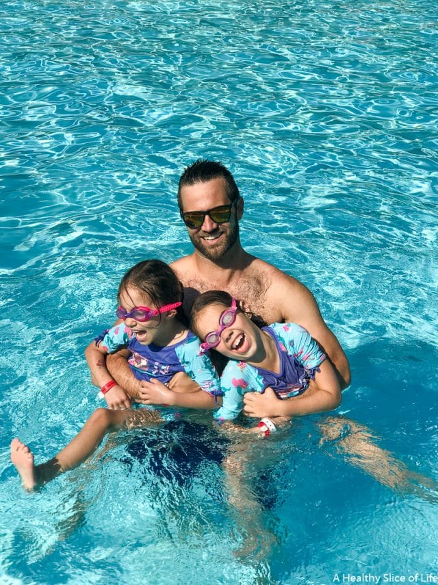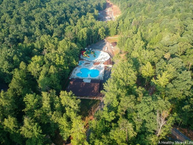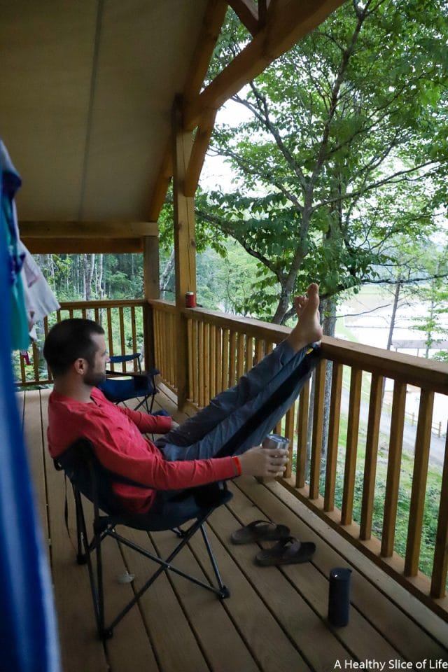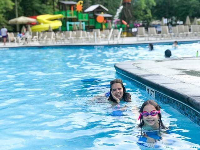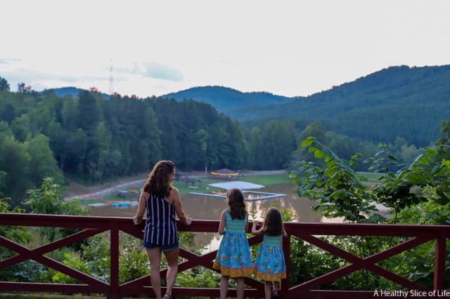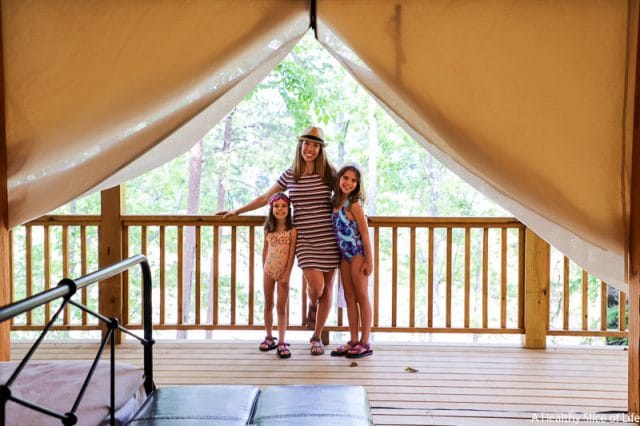 After all our adventure, we ended the evening at the pool. The pool is fabulous in both layout and depth (nothing deeper then 3.5 feet). There are basketball goals, seats in the water, and ample places to set up around it. We ordered food from the adjacent restaurant (their brick oven pizzas were our favorite!) and let the girls swim until they exhausted themselves. Then we all went back, showered off, and put the girls to bed while David and I enjoyed a glass of wine on the glamping tent’s back porch, overlooking the lake.