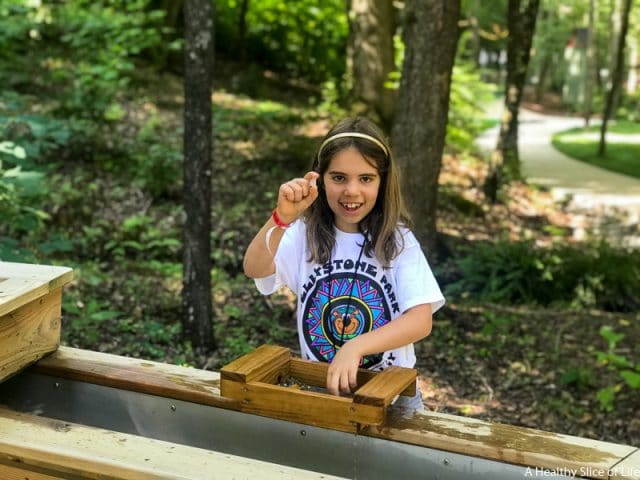 After breakfast, we let the girls dictate the schedule. Their first request was crafts, so we went straight there and they each made a layered sand art castle. From there we stopped by the camping store to get bags of dirt (also on the fun pass) to go gen mining. The gem mining is cute. It’s a small setup sandwiched between the lake and putt putt course, and the kids thought finding hidden gems was pretty cool, especially the rose quartz they acquired!