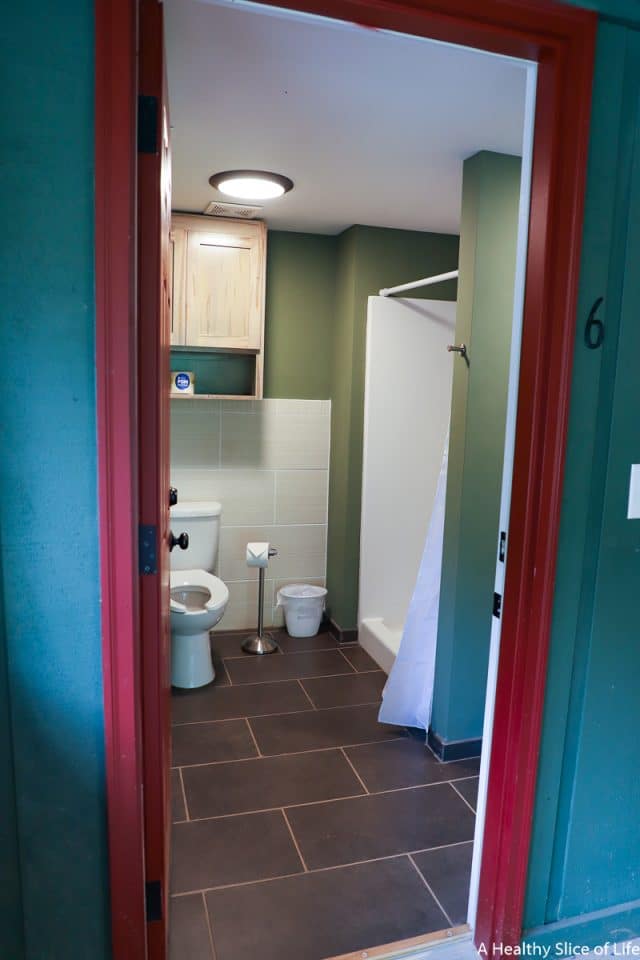 Just a short walk up the hill from our front door was a cabin that housed 3 individual bathrooms, one for each glamping tent, and each under lock and key. Our bathroom had a toilet, a shower, and a sink. I was so pleased to see it was incredibly clean and air conditioned as well. It was such a great convenience to have, making it feel much more like glamping than camping.