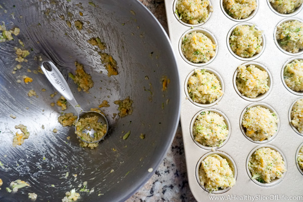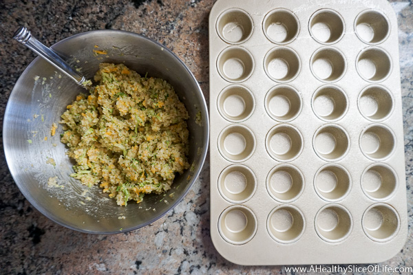 Spray a mini-muffin pan with non-stick spray (or I love this mini pan option which makes them so easy to pop out!) and spoon mixture into each cup, pressing down mixture into each cup as you go.